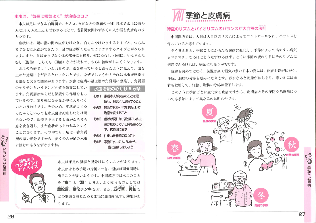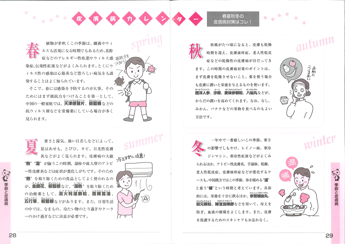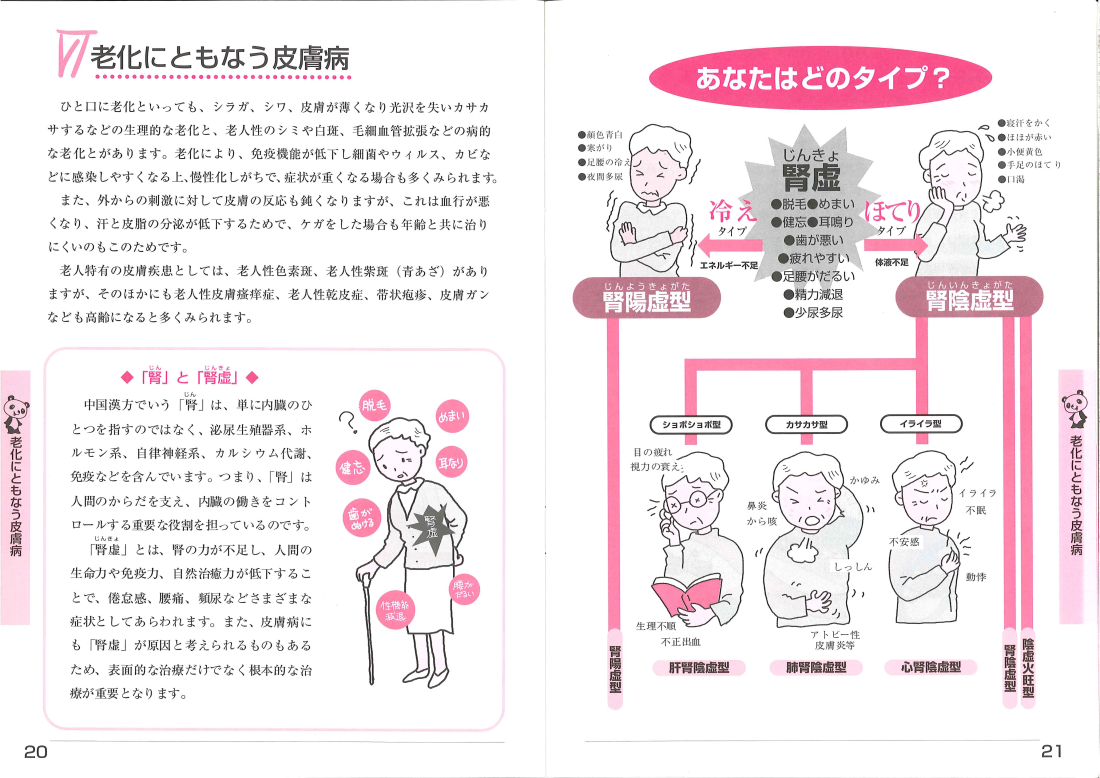 皮膚病のはなし 増え続ける皮膚のトラブル 皮膚と中国漢方 アトピー性皮膚炎と中国漢方 段階に応じた治療法 こどもと皮膚病 アトピーっ子の育児法 女性の大敵”皮膚のトラブル” 素肌美と漢方エステ ー 皮膚の保護 老化にともなう皮膚病 潤いと栄養の不足が老化を早め、皮膚病の原因に いろいろな皮膚病 水虫は”気長に根気よく”が治療のコツ・季節と皮膚病 皮膚病カレンダー~春夏秋冬の皮膚病対策 皮膚症状の中国漢方によるとらえ方・よくみられる皮膚病の症例